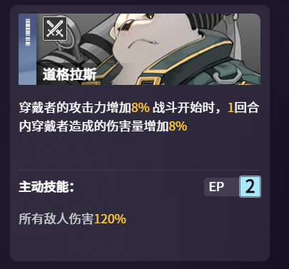三星熊道格拉斯拥有主动和被动两个技能。他的被动技能名叫护卫,可以使穿戴者获得8%的攻击力提升。此技能还能够在战斗开始时使得责任主战员所造成的伤害总量提升8%,是一个十分万金油的增伤型技能。配合能够强力输出的主c,能够在游戏开局就对敌人造成可观的伤害。玩家们也可以耗费两点EP来使用他的主动技能巨型火箭筒,实现120%的伤害增幅。值得注意的是,这个技能是整体增益,使用后可以对全体敌人造成伤害提升。玩家们使用该技能来配合责任主战员的话,可以造成一回合内的大范围伤害,不论是清杂还是挑战boss都会很好用。