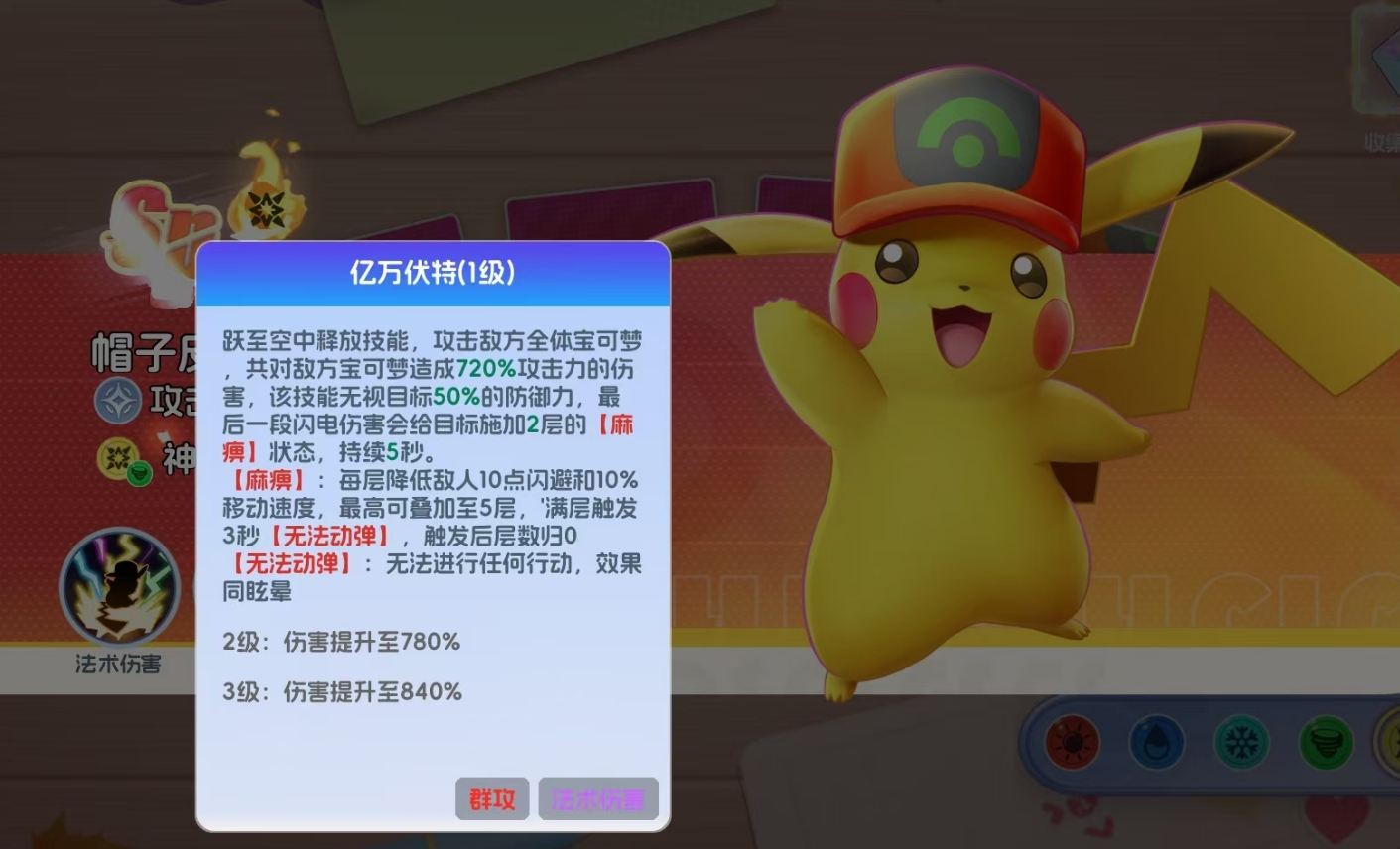 帽子皮卡丘的核心输出逻辑围绕大招展开。其怒气积满后,可跃升至空中,对敌方全体目标释放高倍率雷电伤害。该技能具备“倍率恒定”特性——无论命中单体还是多个目标,基础伤害系数完全一致,无任何衰减。此外,该大招还附带50%防御穿透效果,在中后期高防环境(如Boss战、高难度副本)中,能显著提升实际伤害转化效率,是应对高坦度阵容的关键手段。