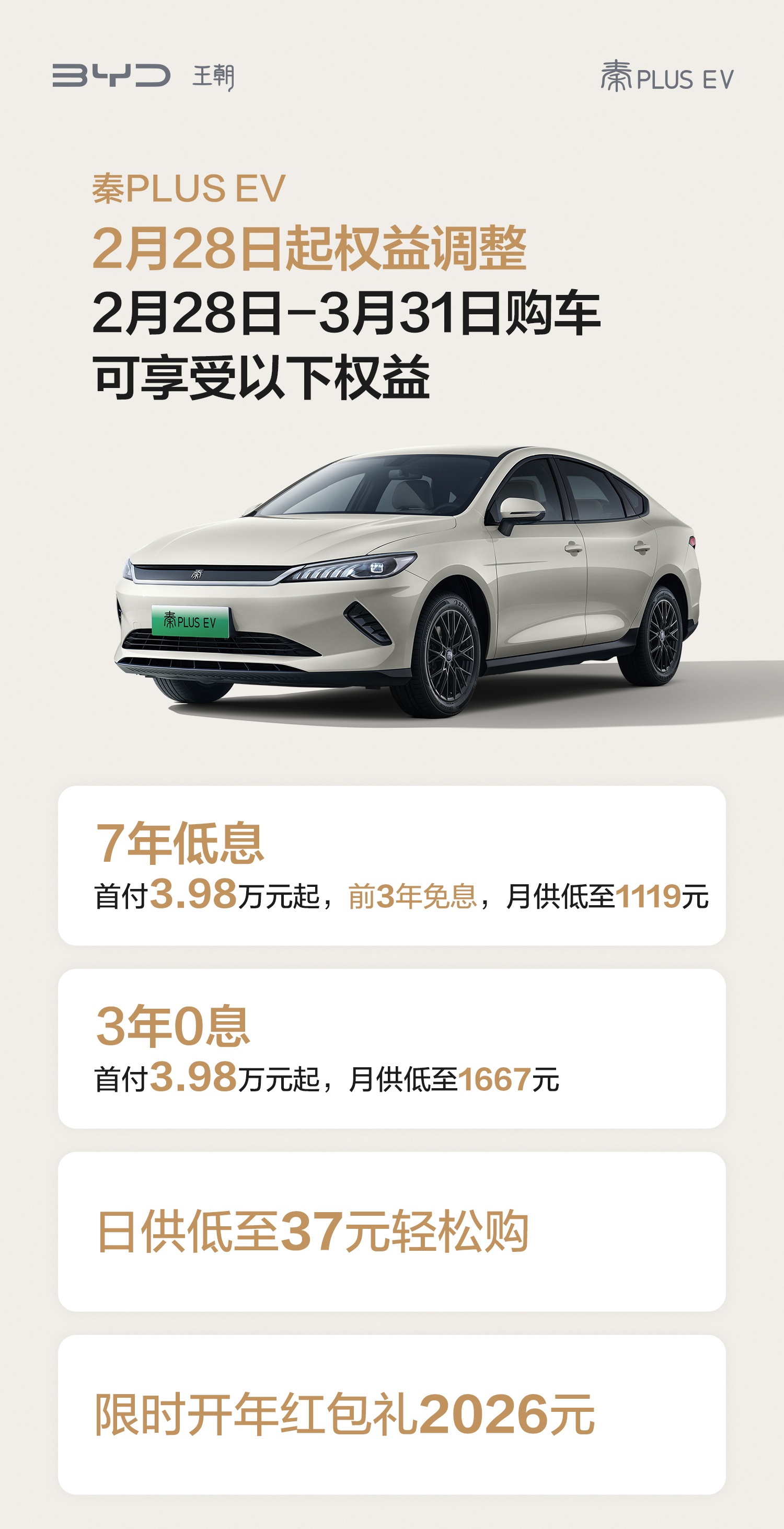 比亚迪王朝网销售事业部总经理路天今日官宣,比亚迪秦 PLUS 迎来史上最强金融政策(3 月 31 日截止):3 年 0 息方案:首付 2.98 万起,月供低至 1389 元;7 年低息方案:首付 2.98 万元起,前 3 年免息,月供低至 933 元。