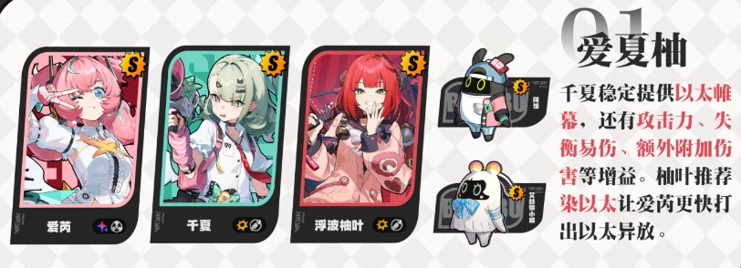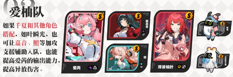 辅助角色的选择上也比较宽泛,首先最为契合的为「千夏」,能通过不错的增益的同时还能,主动开启关闭【以太帷幕】提高【应援能量】的获取,整体机制上比较契合,并且搭配「爱芮」还能触发彩蛋;其次可在「耀嘉音」、「柚叶」、「照」这类增益不错的角色中选择
