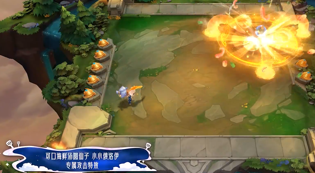 2、专属淘汰特效:用粗壮的汤圆触手缠住敌方小小英雄,拖拽到一个冒着热气的迷你海鲜汤锅上方;敌方被包裹进金色蒸汽后,会化作几颗小汤圆粒子消散。俄洛伊还会做「掀锅盖」的收尾动作,音效搭配咕嘟冒泡声,趣味性拉满。