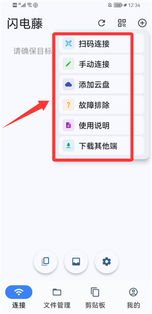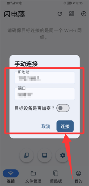 闪电藤app怎么连接,进入应用后点击右上角加号,展开菜单,在选项列表中选择手动连接功能,进入页面,输入设备的IP与端口信息,确认进行连接。