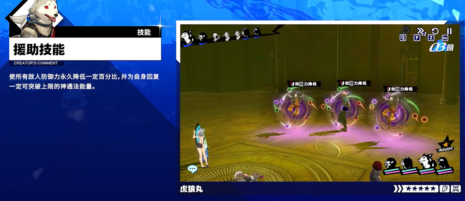 虎狼丸最核心的机制是,战斗开始时,要手动指定一名同伴当饲主,这个步骤不能省,选完之后,他会自动释放援助技能,之后就进入跟着饲主走的状态了。选不同类型的同伴效果还不一样,如果饲主是S.E.E.S.的队友,饲主可以直接通过援助技能栏里的指令,让虎狼丸放技能,而且这之后,饲主还能继续用自己的援助技能,相当于多出来一个操作空间。如果饲主不是S.E.E.S.的队友,那虎狼丸就会在饲主回合开始时,按照饲主的属性自动判断放哪个技能,这种情况下,就没那么多手动空间了,更偏向自动配合的感觉。虎狼丸虽然没有自己的回合,但他在饲主回合开始和结束的时候,该触发的效果还是会触发,所以这块不用担心会白白浪费掉。