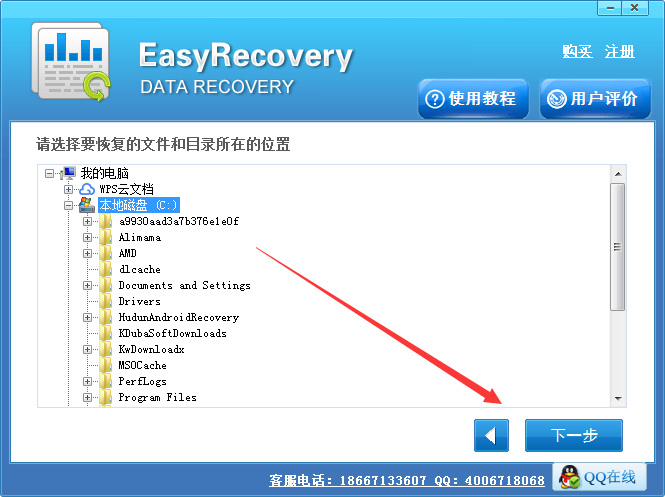 步骤2,选择删除文件所在分区,扫描磁盘。选择相应模式后,则需要选择删除文件所在分区,如果是桌面文件或是回收站文件,请选择“C盘”,或是指定相应文件夹,选择后,请点击“下一步”进入文件扫描状态,静待软件完成扫描。