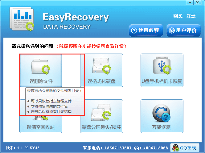 步骤1,选择相应数据恢复功能。EasyRecovery®数据恢复软件一款专业的数据恢复软件,针对的不同的数据丢失情况设置了相应的数据恢复模式,用户可以根据自己遇到的情况进行选择,这里想要恢复永久删除的文件,只需选择“误删除文件”功能键即可进入数据恢复。