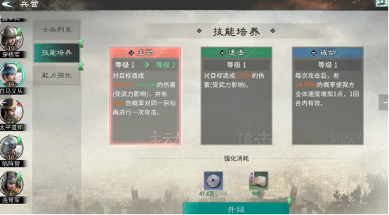 主要的核心特色就是优先提升兵营等级,集中相应的资源培养众多具有特技的士兵。首先要注重的就是兵营建设以及征兵,具体的士兵等级和兵营绑定是非常关键的,士兵等级并没有办法单独提升,完全取决于兵营的等级,当兵营升级之后,士兵便会自动获得对应的等级基础属性。日常征兵非常关键,每天务必都要及时进入募兵所完成征兵,并及时返回兵营,完成升级,士兵的基础属性越强,后续培养收益也就越高。
