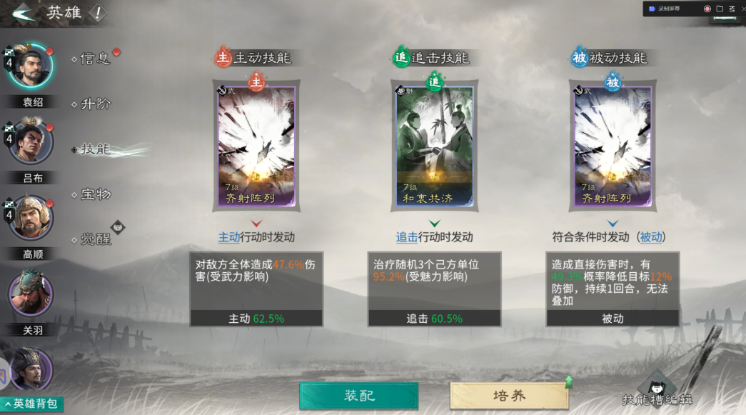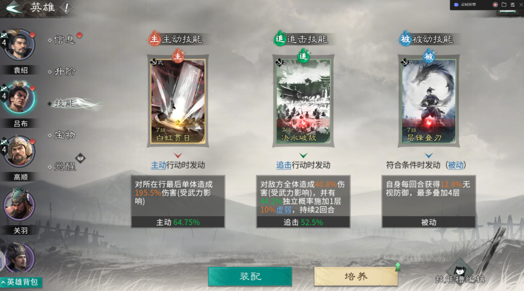 技能搭配千万别乱带,带错了效果差很多。高顺的被动一定要带一夫当关,虽然牺牲了输出但是特别硬,让他能站得住脚,主动技能可以选首尾相援来回血减伤,保证他不倒下。吕布的主动技能固定带白虹贯日,专门盯着对面后排脆皮打,追击技能带决水破敌,能挂虚弱状态压对面血量,被动选层锋叠刃来叠加无视防御的效果,打到后面越打越疼。袁绍的主动和被动都推荐带齐射阵列,压血线的同时还能破防,追击技能选和衷共济来给队友加血,充当半个奶妈。