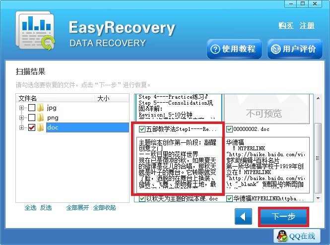第三步:扫描完成之后,在界面左侧显示有文件对应的格式信息,在其中找到误删文件对应的勾选上,右侧就显示有具体的文件信息,在其中找到需要的勾选,之后点击“下一步”按钮。
