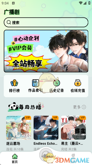 进入APP首页,可查看“每周热播”的广播剧推荐,使用“排行榜”“作品索引”“历史记录”“在线充值”等功能,也可通过搜索框查找感兴趣的内容。