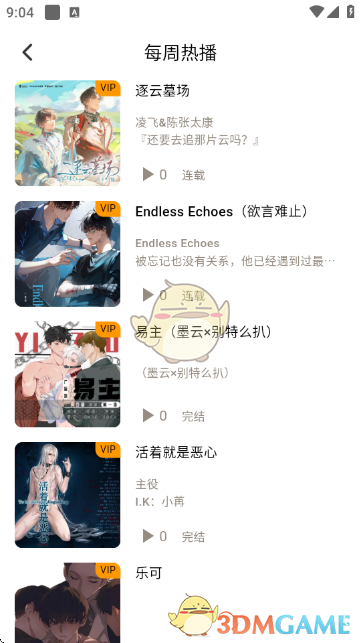在“每周热播”列表中,可浏览当前热门的广播剧作品,了解其连载状态、主演等信息,选择感兴趣的作品收听。