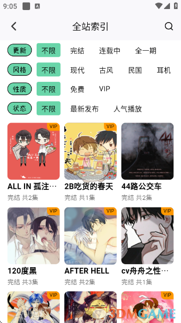 在“全站索引”界面,可通过更新状态、风格、性质、状态等条件筛选广播剧,精准找到符合需求的作品。