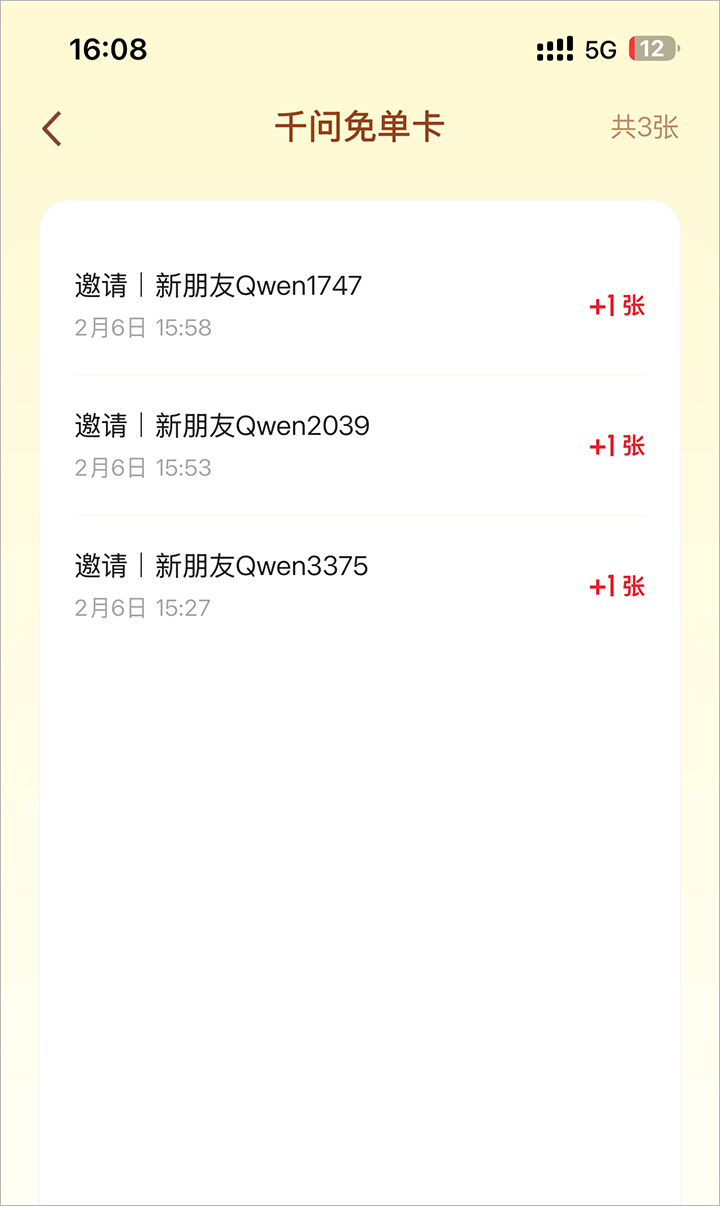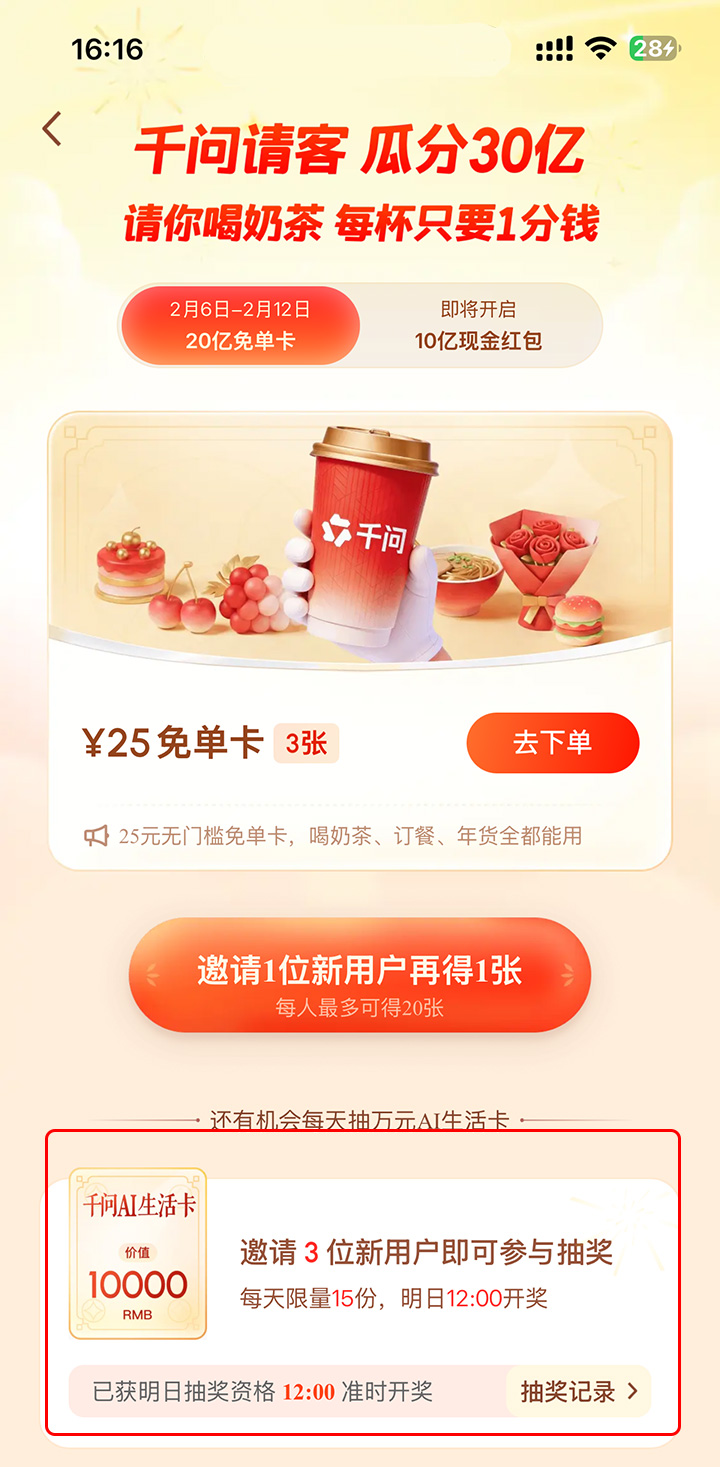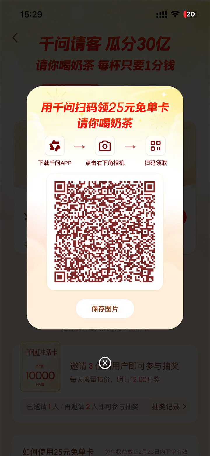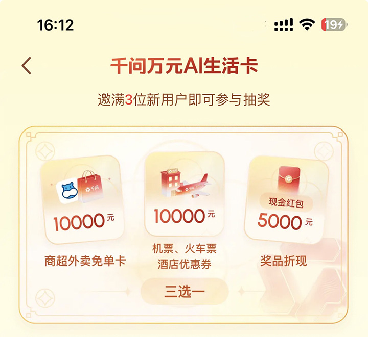 邀请3位新朋友之后即可额外抽取价值万元的千问AI生活卡