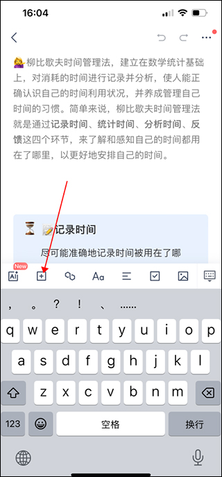 2、进入到笔记详情页面,再点击需要设置跳转链接的位置,在弹出的编辑页面中点击“加号”图标按钮;