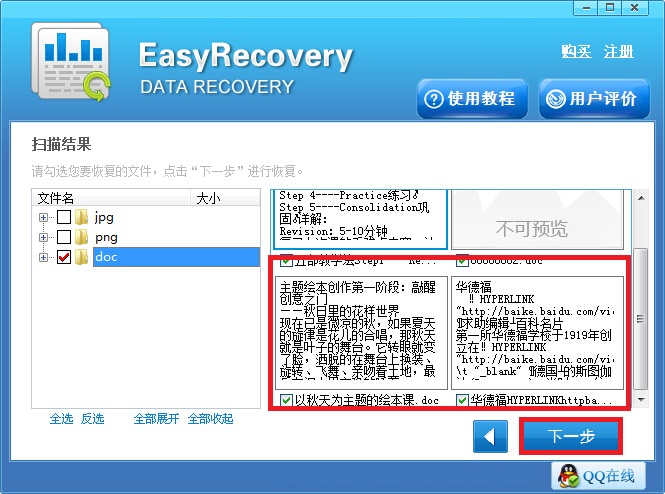 第三步:扫描完成之后,在界面左侧找到误删文件对应的格式点击,右侧就显示有具体的文件信息了,在其中找到需要的文件勾选上,随后点击右下角的“下一步”按钮。