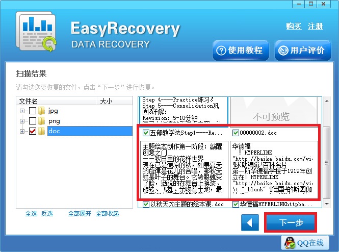 第三步:扫描完成之后,在界面左侧找到误删文件对应的格式点击,右侧就显示有具体的文件信息了, 在其中找到之前误删的勾选上,随后点击“下一步”按钮。
