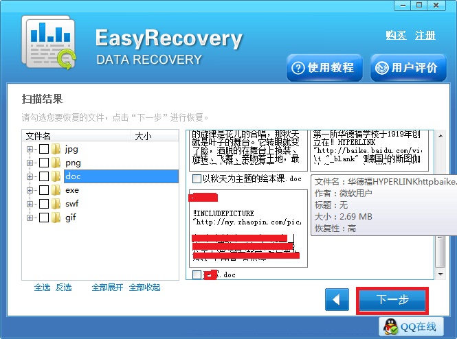 第三步:扫描完成之后,在界面左侧找到误删文件对应的格式点击,右侧就显示有具体的文件信息了,在其中找到需要的勾选上,之后点击右下角的“下一步”按钮。(经过回收站清空的文件会被系统重命名,所以查找的时候需注意)