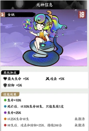 《字走山海》中,神级元神是开荒核心,推荐首选女娲:死亡后可10%生命回生一次,提供极高容错率,相当于多一条命。其次是祝融,每回合自动释放火球并提升灼烧伤害,是火系体系绝对核心。西王母每回合回复10%攻击力生命值,提供稳定续航保障。