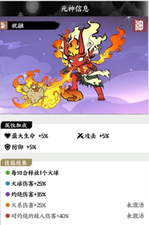 1、自成体系:祝融是火系玩法的绝对核心。他的存在让你可以无脑选择火系神通(技能),每拿到一个火系技能,你的伤害都会成倍增长。