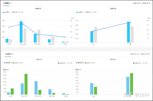 小编根据网上数据以及下图对比查询得知,QQ音乐和酷狗的用户画像年龄在年轻人的分布占比很多,都是受年轻人青睐的一类。
