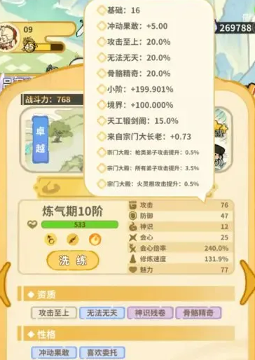 洗资质的时候有一个小细节可以注意。修炼速度这个资质影响的是打坐效率,作用比较小,洗的时候如果出现了修炼速度的词条,可以先保留不动,等弟子境界升满之后再去洗掉,这样不会浪费洗练次数。