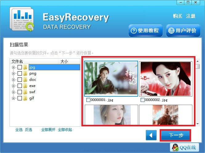 第三步:扫描完成之后,在界面左侧找到误删文件对应的格式点击,右侧就显示有具体的文件信息了,在其中找到之前误删的勾选上,随后点击右下角的“下一步”按钮。