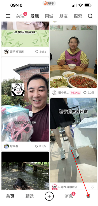 1、打开快手app,进入发现主页,点击右下角的“我的”按钮;
