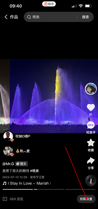 3、进入到作品播放页面后点击右下角的“权限设置”按钮;