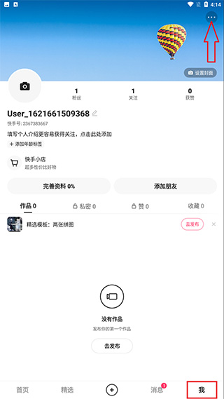 1、首先进入快手首页,点击下方我的,进入后点击右上方的三个点图标