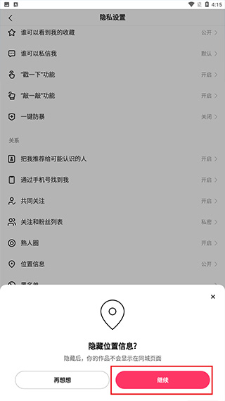 5、最后点击继续关闭,这样别人就看不到你的IP地址了,同时你的作品也不会被放在同城的作品集上