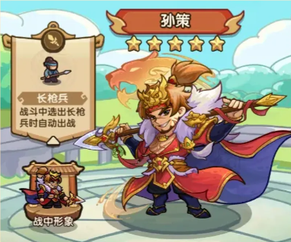 2、实战优势:长枪兵阵容的核心增伤点,提供攻速这一万金油稀缺属性,增益全程覆盖;适配长枪兵「连击、血爆」卡牌,兵营18级解锁的「狂暴之枪」与孙策攻速加持完美契合,多次触发血爆与狂暴,续航爆发双质变。
