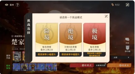 险境模式下,每名侠客最多上阵2次,通关后橙装掉落概率小幅提升。
