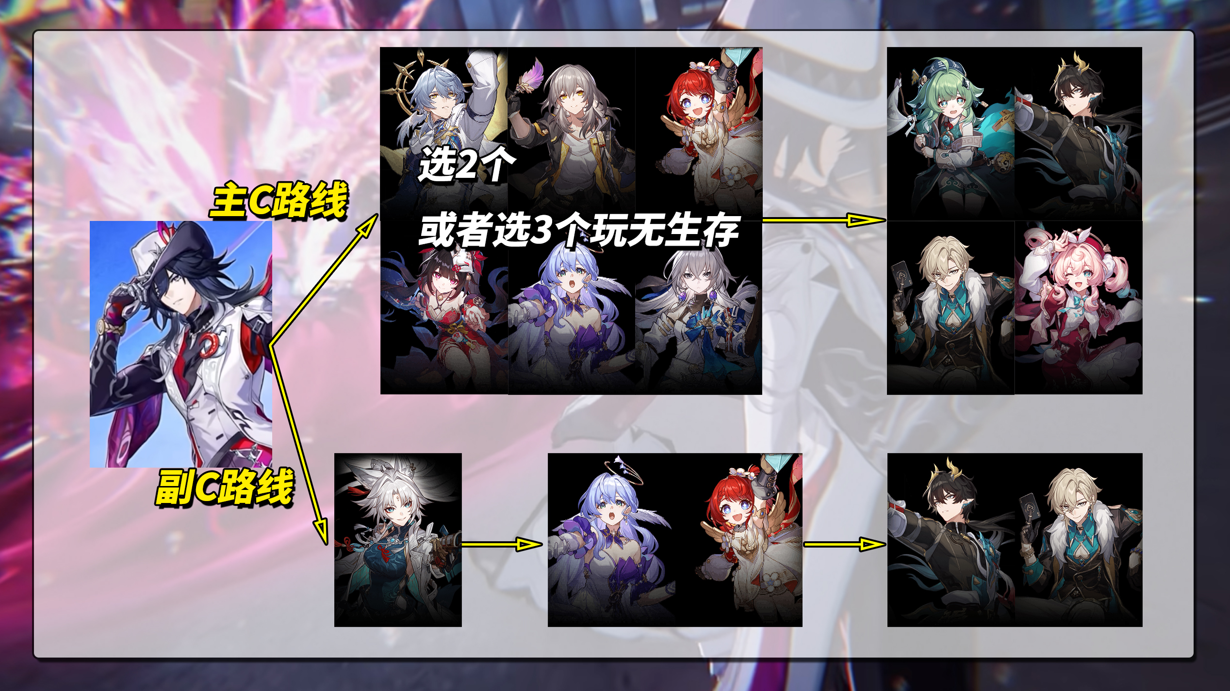 不死途(主C)+星期日/记忆主/缇宝/花火/知更鸟/布洛妮娅(选2个)+藿藿/腾荒/风堇/砂金。