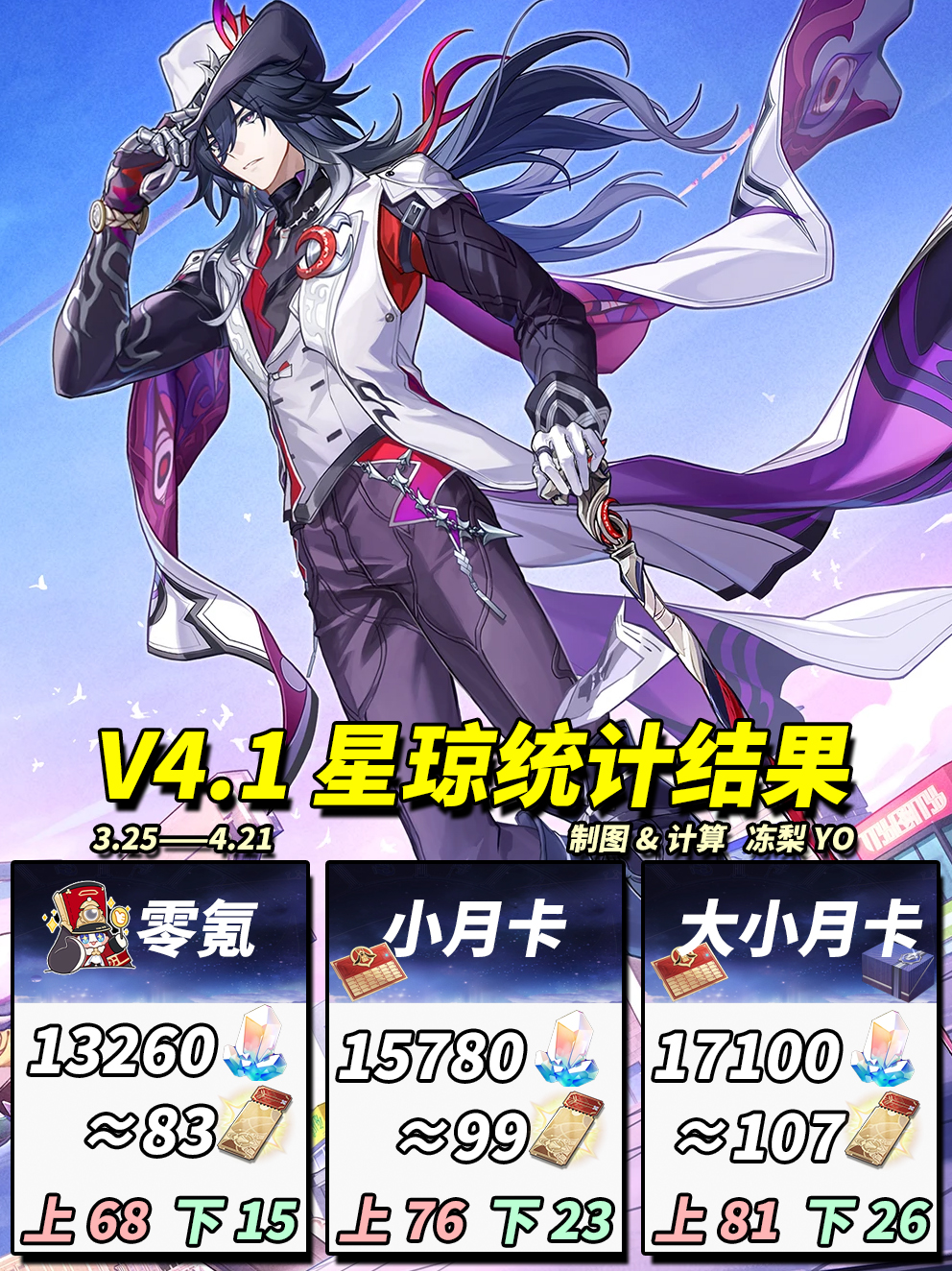 崩坏星穹铁道4.1版本可获取多少星琼,此次4.1版本将在正常版本基础上缩短2周,持续时间为“3.25~4.21”,共28天。战术性调整无需担忧,新地图、主线、差分宇宙、活动一个不少,下图是可获抽卡资源统计: