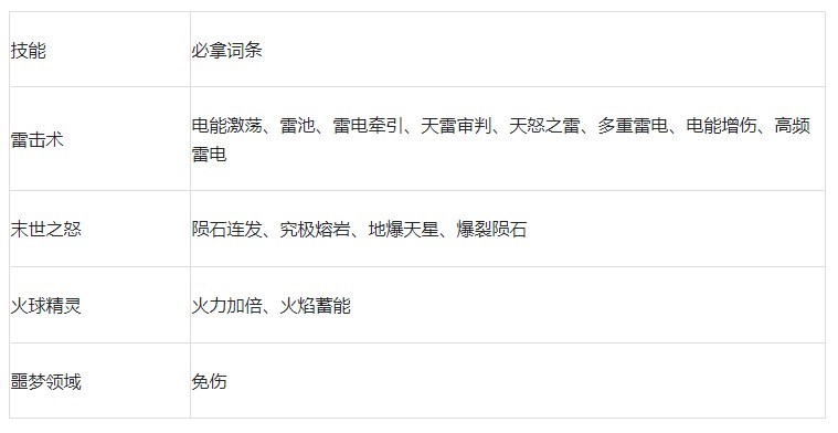搭配说明:所有技能前期就送,【雷击术】有着不错的追踪效果,拿到【电能激荡】、【天雷审判】后伤害很高,配合【末世之怒】可快速完成清怪,【火球精灵】提供的灼烧快帮【雷击术】触发雷池效果。【噩梦领域】提供续航。
