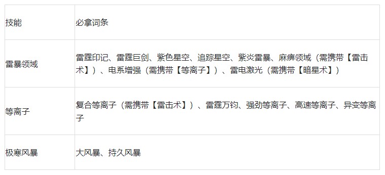 注:核心技能【雷暴领域】至少要升到2级后再使用本流派。若玩家已经解锁了【暗星术】,可用它来替换【极寒风暴】,同时词条必拿【雷电激光】。