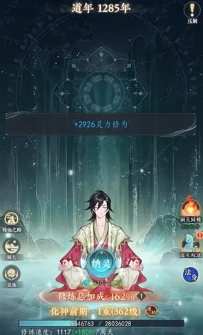 玩家将开启自动修炼,纳灵以外,还可以解放双手,全天放置就可以获取修为