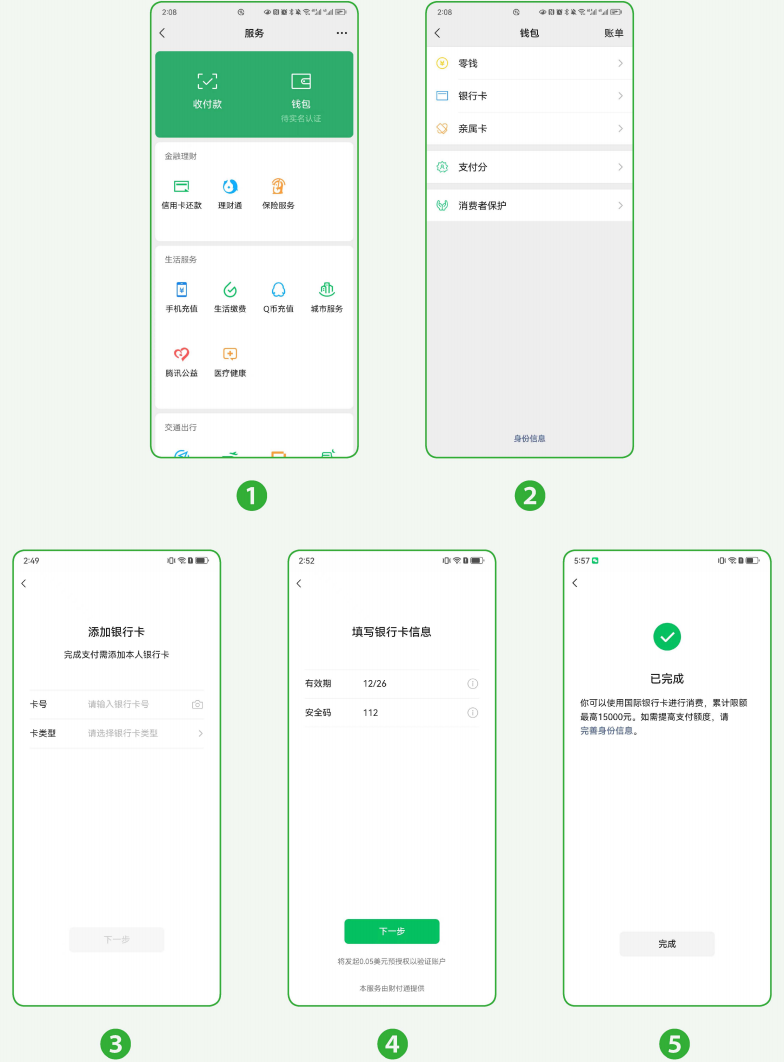 提示:微信支付目前支持绑定Visa、Mastercard、American Express、JCBDiners Club、Discover 等银行卡。