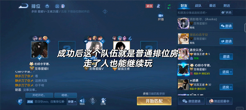 目前仅5V5排位(匹配)和10V10排位(匹配),都必须得满伍,双三排无法开局对局,缺人可以尝试招募或邀请好友一起组队开黑。