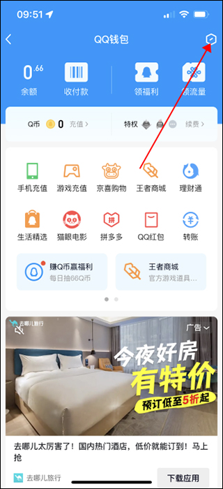 2、进入到qq钱包页面,再点击页面右上角的“设置”图标按钮;