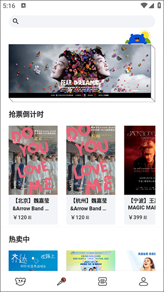 1、在纷玩岛app首页上有各种演唱会购票预热链接,点击购票栏;