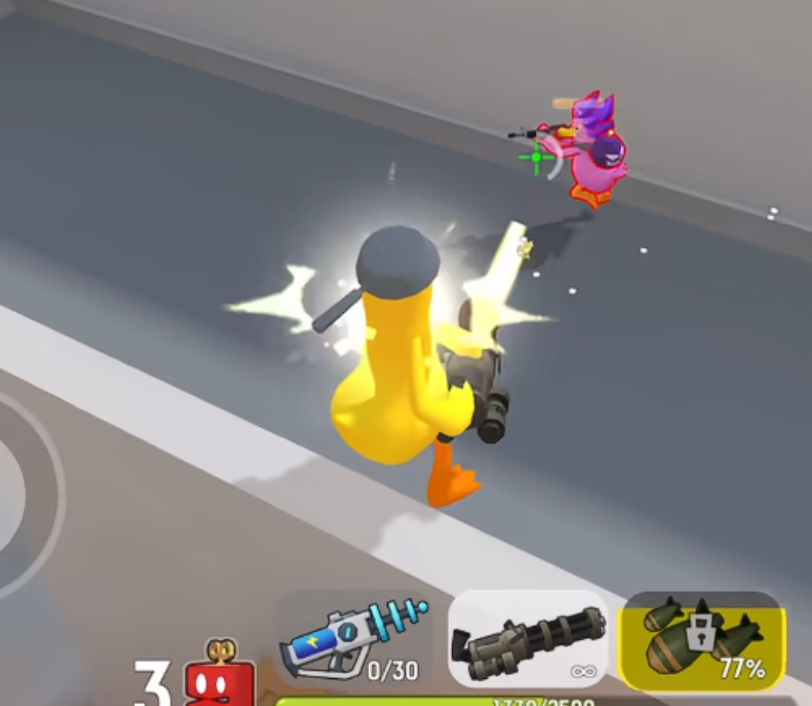 突袭导弹属于战斗鸡的主要杀伤性武器,它的威力在于向目标发射大规模高爆弹药,能迅速提升整个团队的输出,并且可以很好地弥补由于火力弱而产生的短板。与普通武器不同的是,它不能直接释放,必须造成有效的伤害才能积攒能量。游戏开始时,玩家需要使用射速快但是单发伤害低的电波枪,在战场边缘消耗敌人,当武器命中敌人的时候,屏幕下方的技能进度条就会慢慢加载,这是解锁导弹的前提条件。