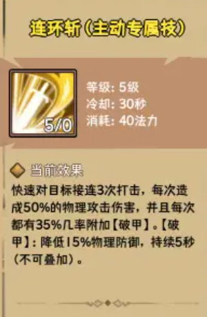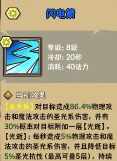 所以,优先进行技能加点的话,核心输出是一定要前期升起来的,然后后期根据大家面对的场景来进行生存续航之类的加成,控场技能效果在此时也可以点起来,而被动技能效果上面大家就放在顺序的最后位,因为他的被动能力只要跟主动技能相合的话,基本是没有问题的,在技能效果上面,大家可以将圣辉斩这个技能先提升起来,使用这个技能每次对敌方进行回弹的话,都会造成120%的光明类型伤害效果,特别是其中的最后一次,也只是连击当中的第三次,在其中可以触发一个印记能力,这个印记能力叠加起来的话,可以给他带来的增伤是每一层都有8%的,所以作为他的一个核心技能,大家可用的机会也比较多,另外这个技能有一个优势,就是在冷却时间上面,只要8秒就可以再一次使用,所以他前期的这个印记用完了之后,可以快速的再一次叠加更多的印记层数伤害效果,相对于这个技能来说连贯的程度还是比较高的。