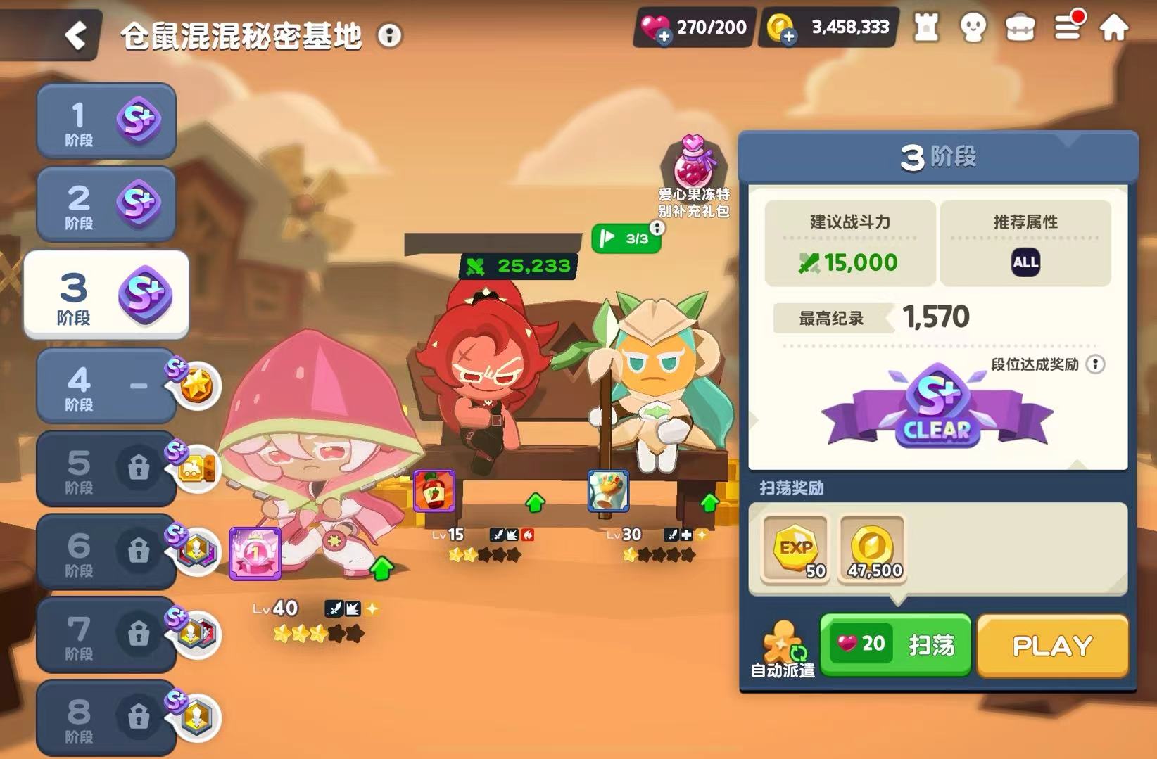 接着说第二个经验之塔:仓鼠混混秘密基地,和六角蜂森林一样,它也有着战斗力的要求,随着爬塔进度越来越高,也会出现推荐的饼干人属性。在这里大家能获得的挑战奖励是金币和经验,一阶段获得的经验是30点,金币为22000,8阶段获得的经验是160点,金币为135000。这个关卡中玩家们需要在规定时间内打败尽可能多的小怪,关卡会根据击败数量来给大家评分,最高为S+,能够拿到顶格奖励。