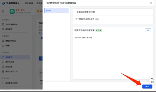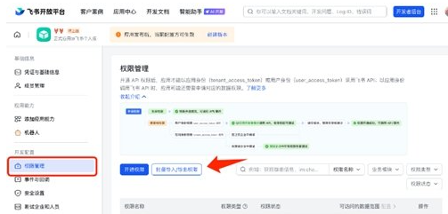在应用详情页左侧菜单中,点击「权限管理」,然后选择「批量导入/导出权限」。