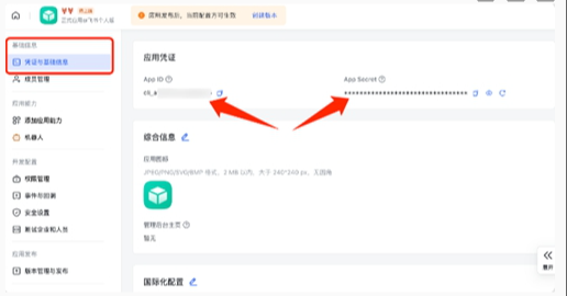 1、在应用详情页左侧菜单中,点击「凭证与基础信息」。