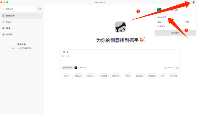 1、打开Claw设置:在WorkBuddy中,点击右上角的个人头像,选择「Claw设置」。