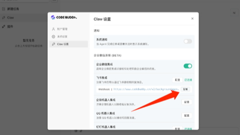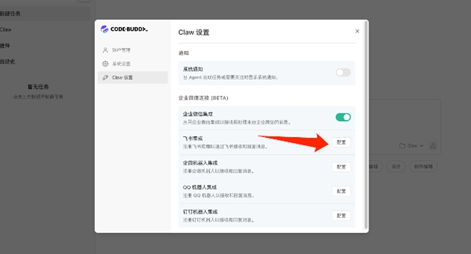 2、选择飞书集成:在Claw设置页面中,选择「飞书集成」选项。