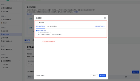 在「事件配置」区域,点击「添加事件」,搜索并添加「接收消息」事件。