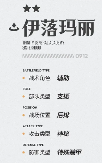 先从她的定位说起。伊落玛丽是一个支援型角色,放在后排使用,攻击类型是神秘,防御类型是特殊装甲。光看这个配置,很多人可能会觉得她是个普通的奶妈,其实没那么简单。