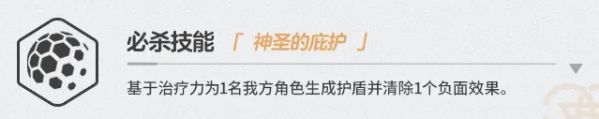 最后是必杀技能「神圣的庇护」,基于治疗力给一名我方角色生成护盾,同时清除一个负面效果。这个技能有两个功能叠在一起,护盾保护目标不被直接打倒,顺便清个负面效果,可以解掉一些危险的状态。需要注意的是,护盾只能给一个人,所以选择目标的时候要看情况,一般优先给当前血量最危险的角色,或者当前带着负面效果的核心输出。